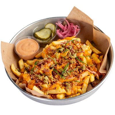 patates kızartması, cheddar sos, bacon, kıtır soğan, turşular ve sos ile servis.