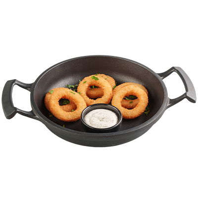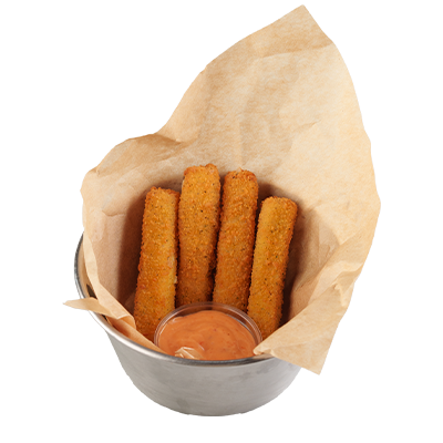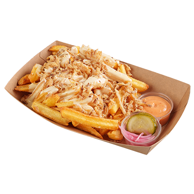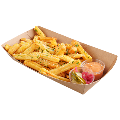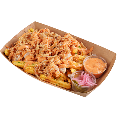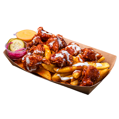 Kajun patates kızartması, Çıtır tavuk parçaları, peynir sos, kıtır soğan ev yapımı turşular ve acı sos ile servis edilir.