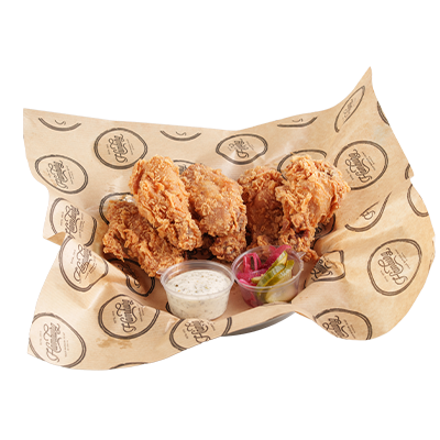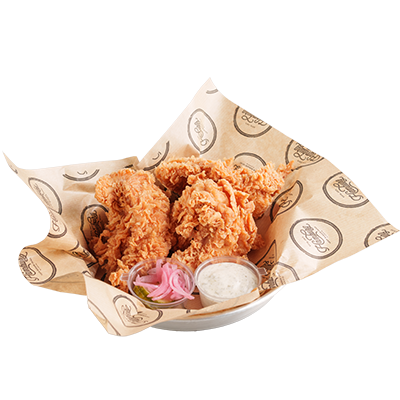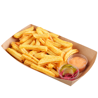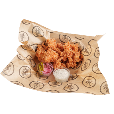 Kajun patates kızartması, Çıtır tavuk parçaları, acılı mayonez, kıtır soğan ev yapımı turşular ve acı sos ile servis edilir.