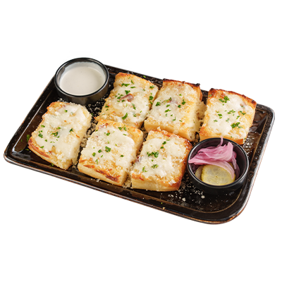 baget, sarımsaklı maydonozlu tereyağ, mozarella, parmesan rende, blue cheese sos ve ev yapımı turşularla servis edilir