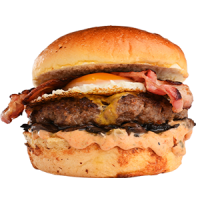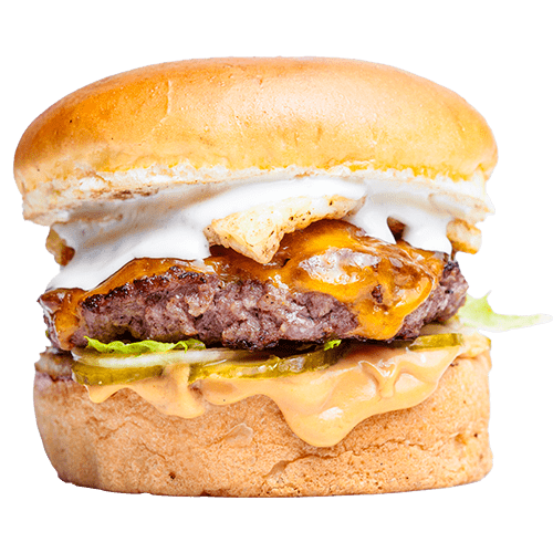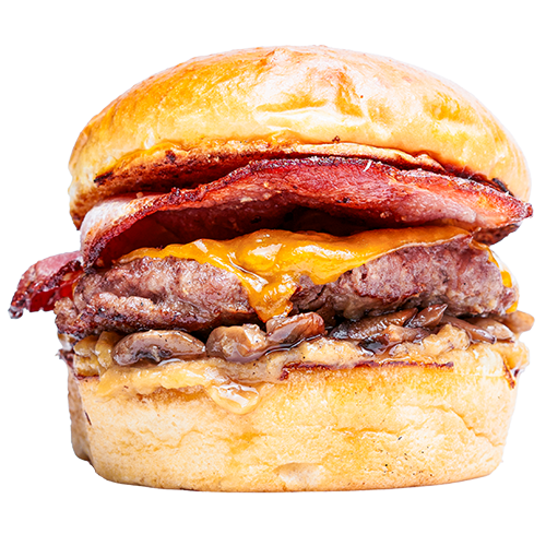 Brioche ekmek, Hamburg Köfte, burger sos, mantar, burger peyniri, yumurta, domuz bacon ve patates kızartması ile ev yapımı turşularla servis edilir.