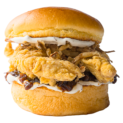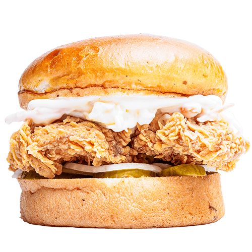 Brıoche ekmek, Tavuk Eti, chili aioli, Nashville Acı Sos, Coleslaw ve patates kızartması ile ev yapımı turşularla servis edilir.