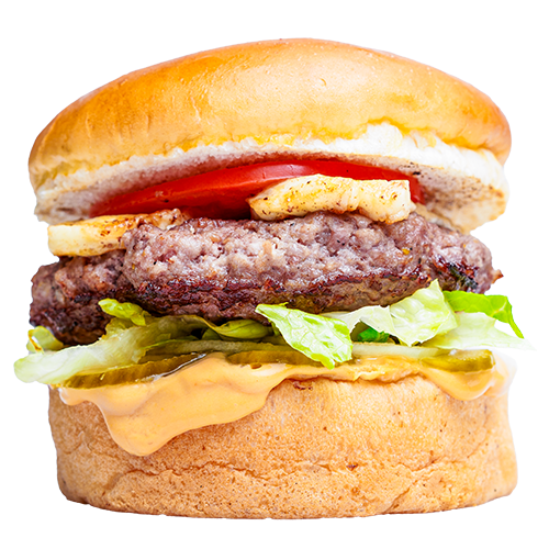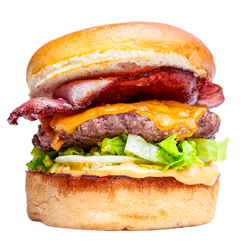 Brıoche ekmek, Domuz bacon, salatalık turşu, burger peyniri, Hamburg köfte, iceberg marul, çiğ soğan, burger sos ve patates kızartması ile ev yapımı turşularla servis edilir.