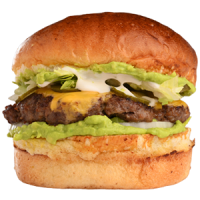 Avokado Püresi, Burger Peyniri, Salatalık Turşu, Hamburg Köfte, Marul, Çig Soğan, Sarımsaklı Mayonez ve patates kızartması ile ev yapımı turşularla servis edilir.