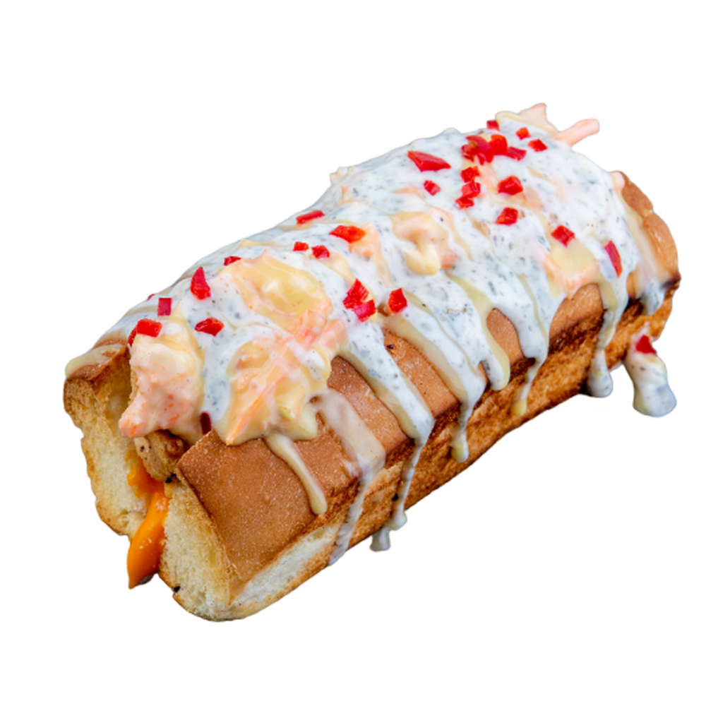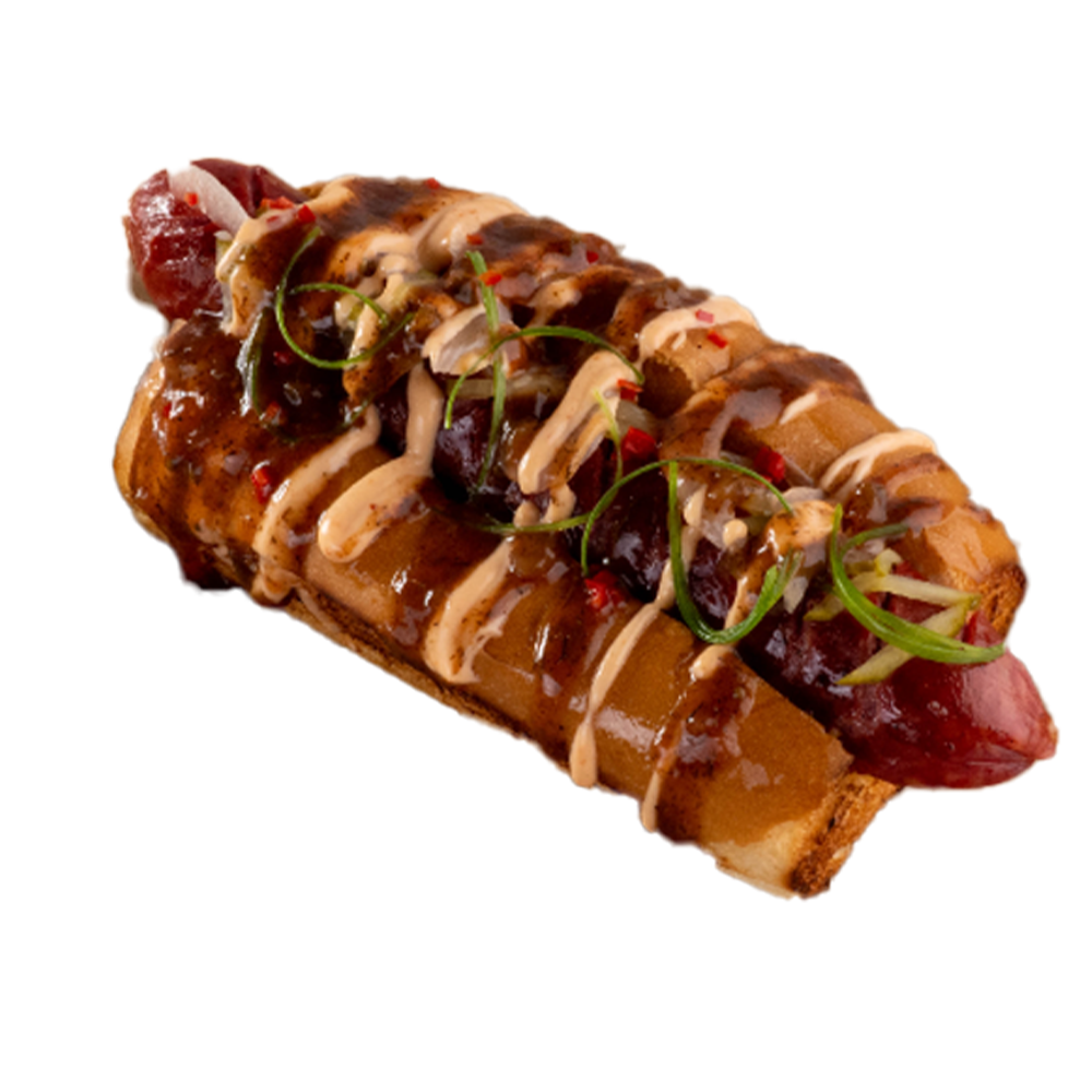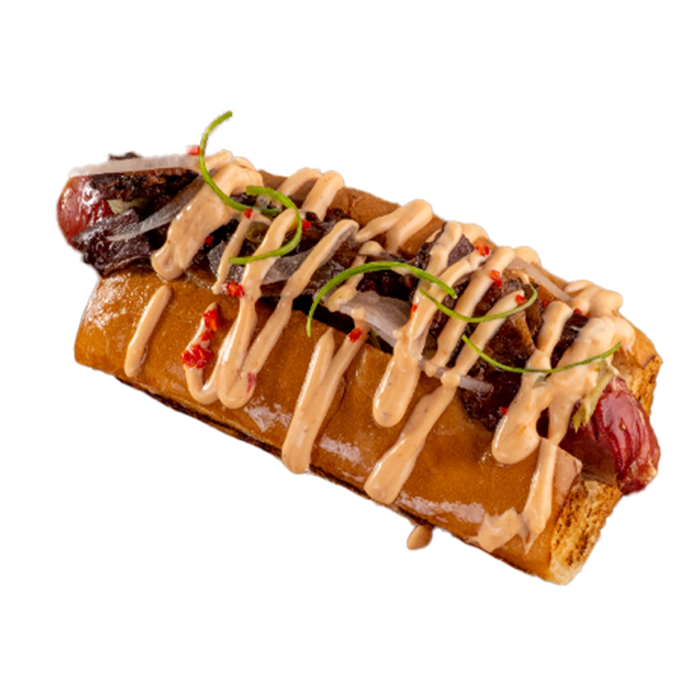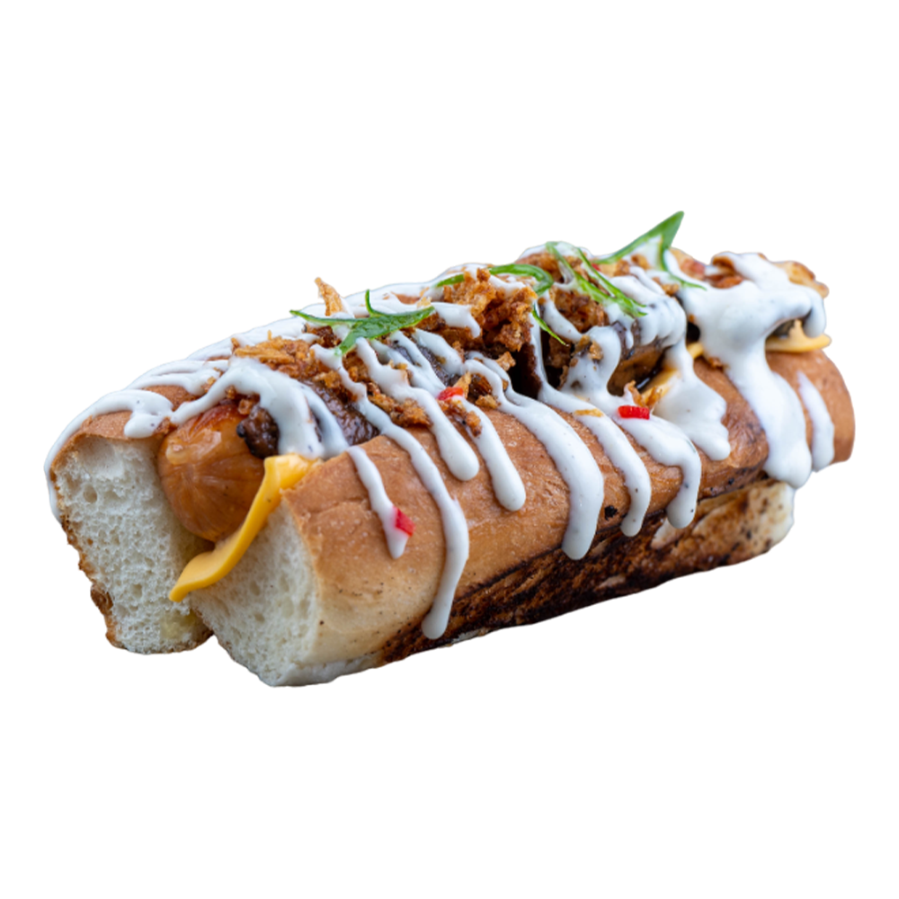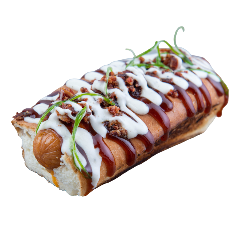 Sosis, peynir, bbq sos, trüflü mayonez, kıtır bacon parçaları, ev yapımı turşular ve patates kızartması servis edilir.