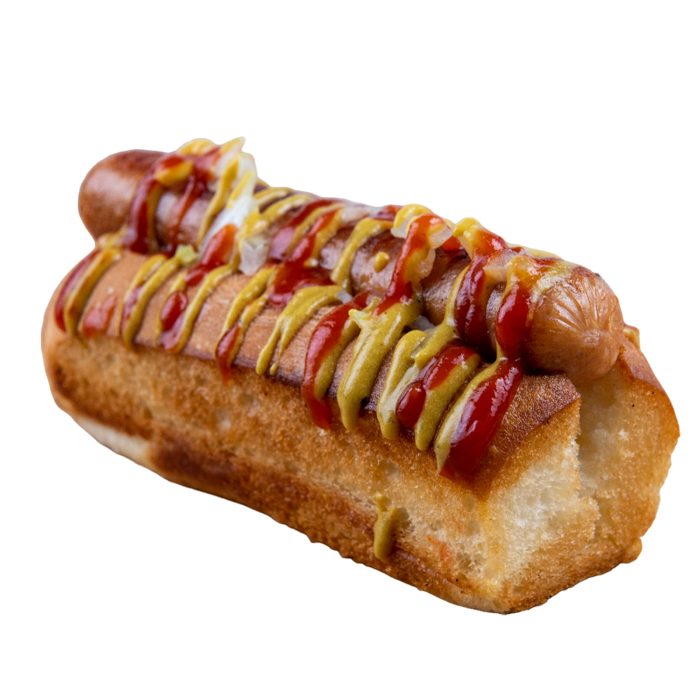 Sosis, ketçap, hardal, ev yapımı turşularla ve patates kızartması servis edilir.