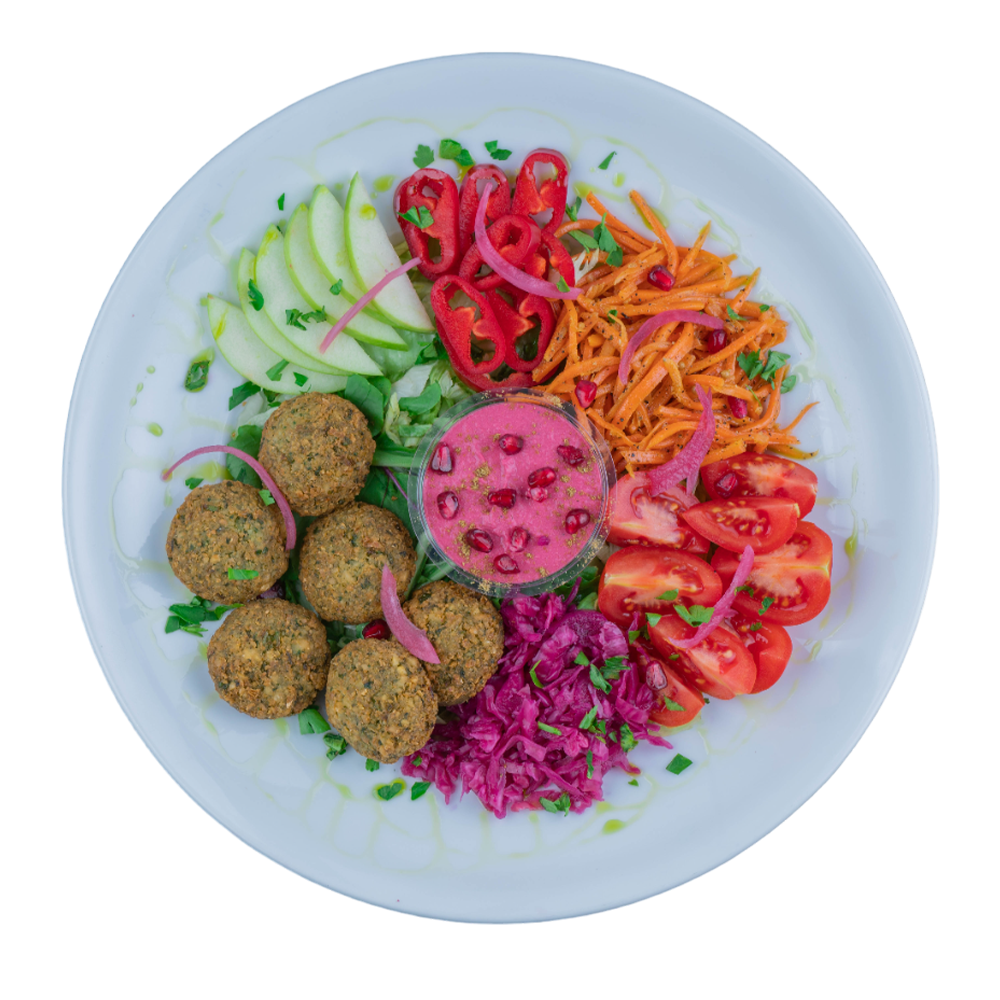 felafel topları, mevsim yeşillikleri, mevsim meyveleri, meysim sebzeleri, humus, kore havuç, kırmızı lahana turşusu.