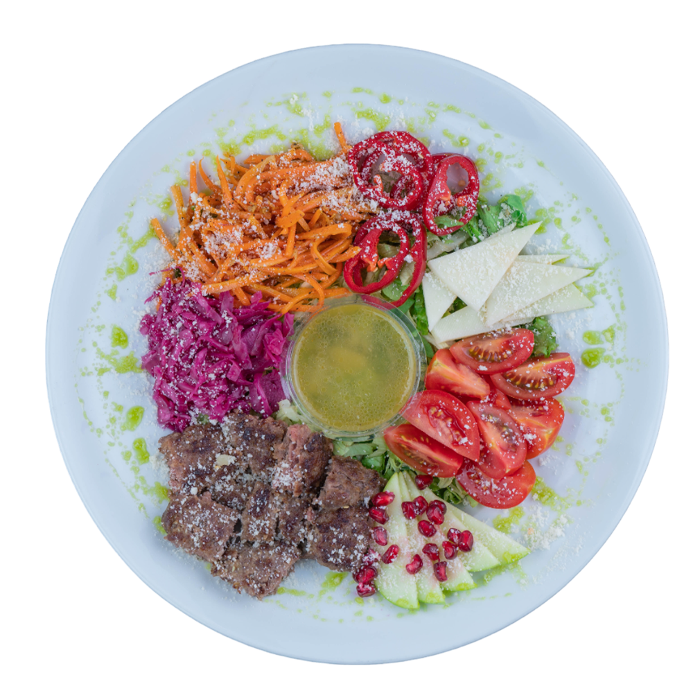 hamburg köfte, mevsim yeşillikleri, mevsim meyveleri, meysim sebzeleri, kore havuç, kırmızı lahana turşusu, peynir, parmesan.