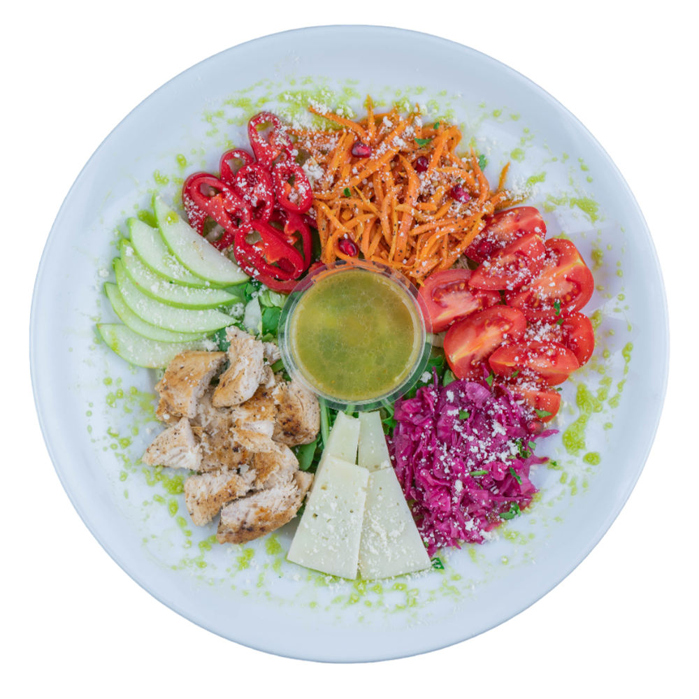 çıtır tavuk, mevsim yeşillikleri, mevsim meyveleri, meysim sebzeleri, kore havuç, kırmızı lahana turşusu, peynir, parmesan.