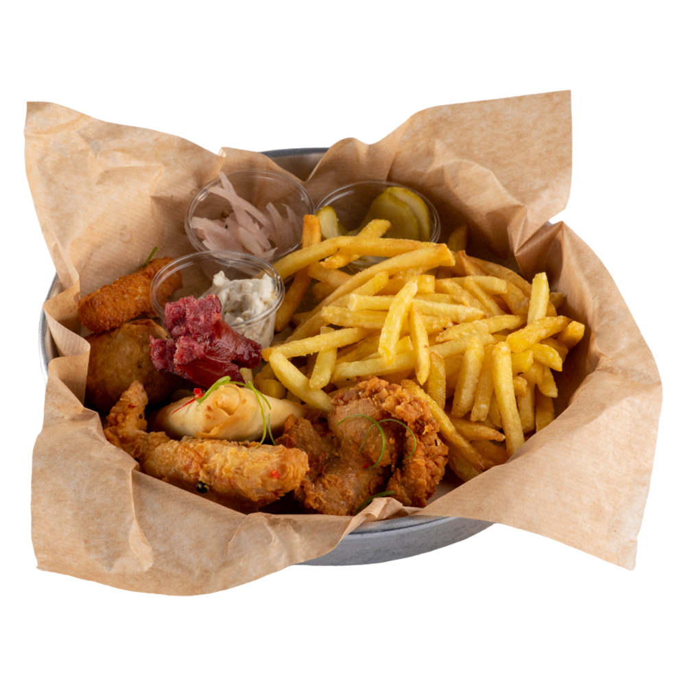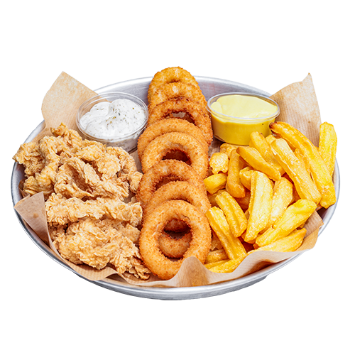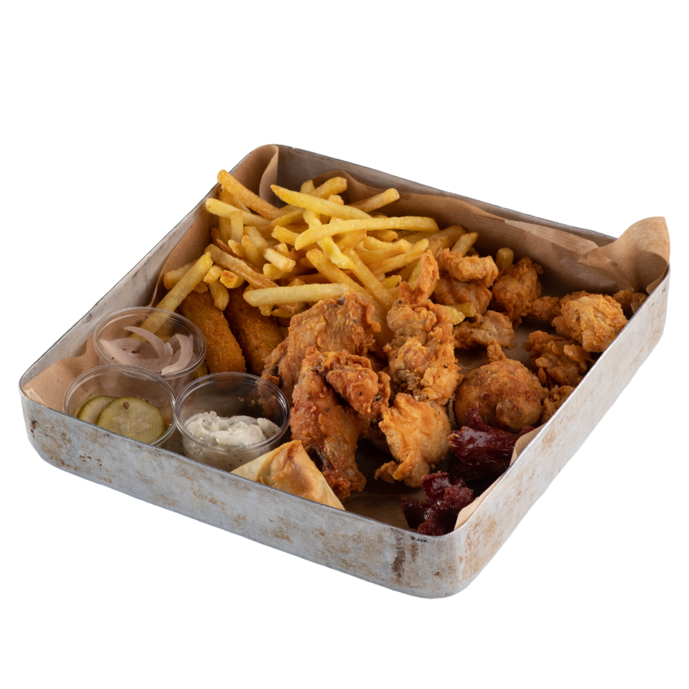 2 Tenders, 2 Kanat, 2 Soğan halkası, 2 Mozzarella Stick, 4 küçük Sosis, 4 parça popcorn, 200 gr patates kızartması, ev yapımı turşu ve ranch sos ile servis edilir.