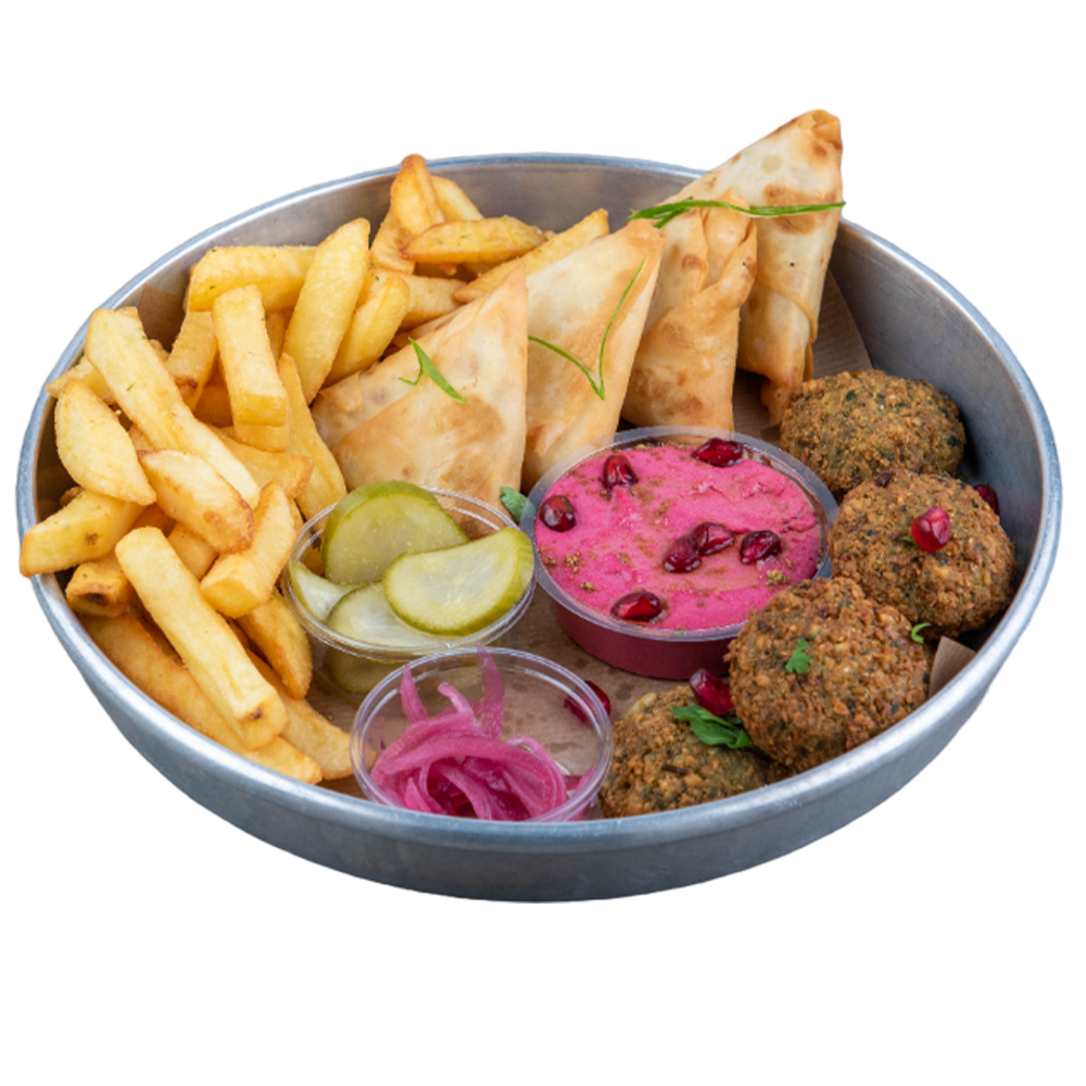 6 Felafel Topları, 4 Samosa, 200 gr patates kızartması, ev yapımı turşu ve humus ile servis edilir.