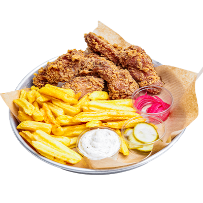 6 adet kanat, patates kızartması, ev yapımı turşular ve ranch sos ile servis.