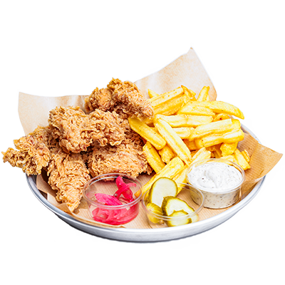 210 Gr Çıtır Tavuk, Patates Kızartması, Ev Yapımı Turşular ve Ranch Sos ile Servis.