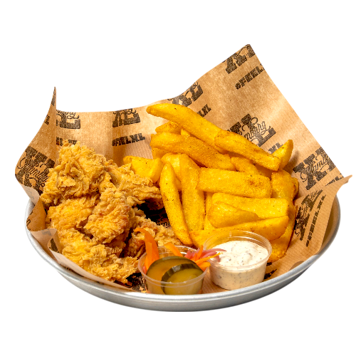 4 adet Tenders Kajun Patates Kızartması, ev yapımı tursular ve Ranch sos ile servis edilir.